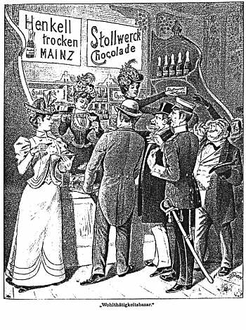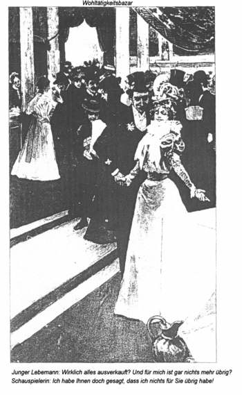 "Schon den Eintretenden umringt ein Herr von Blumen= und Tombolaloos=Verkäuferinnen, und - nun - wer da sein Herz nicht festhält, wird seine Goldstücke bald los, denn - und das bedingt eben den Erfolg - alle diese jugendlichen, schönen Erscheinungen, die uns umringen, gehören - das ist schon auf dem Programm angedeutet - der Gesellschaft an, ja wenn irgend möglich der Hofgesellschaft. Auf das mehr oder weniger Schön und Jung ist zwar im Programm kein Gewicht gelegt, aber der Kassenerfolg pflegt auch nach der Richtung einen Maßstab zu bieten."